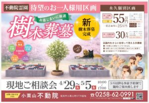 【4/28チラシ折込】新潟県内初!お一人様・ペットと入れる新しい樹木葬が完成。4/29より現地ご相談会を開催します!
