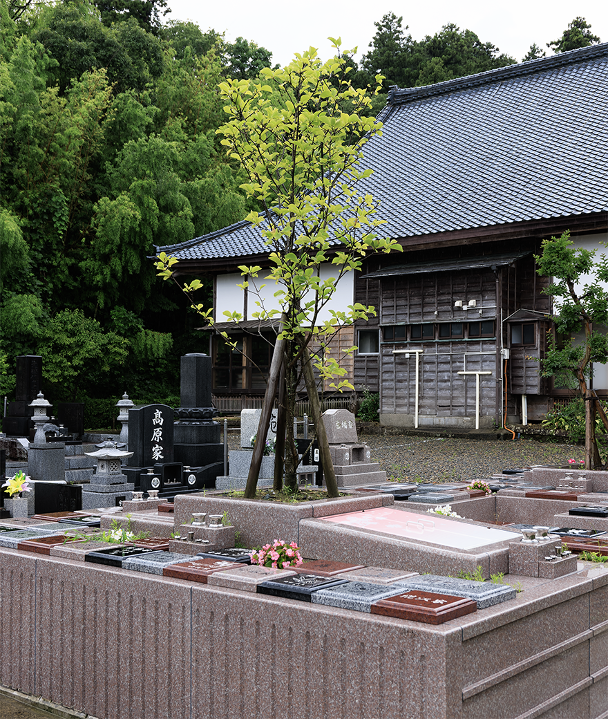 樹木葬とは、樹木やお花を墓標として故人を弔う方法です。当院のように墓地の中央にシンボルとなる樹木を植える形式のほか、ご遺骨を埋葬するたびに新しい苗木を植えるケースなどもあります。