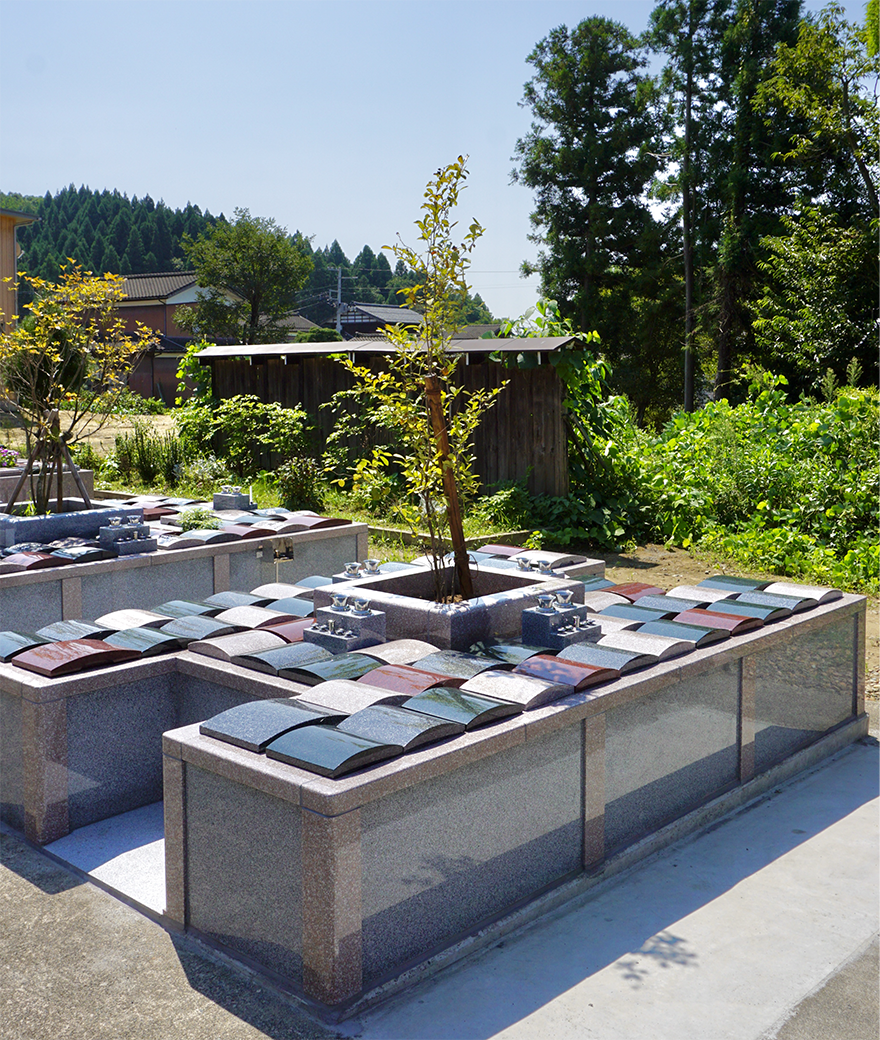 お釈迦様が入滅した際に寝床の四方に生えていたとされる聖なる木・沙羅双樹(サラソウジュ)の樹木葬です。一つの区画をプレートで仕切れる多機能型の設計になっていて、ペットと一緒に埋葬することもできます。プレートはかまぼこ型で、雨水が流れて汚れにくいのも特長。色はピンク、赤、緑、黒から、サイズは6・7人、10人ほど収容可能の区画からお選びいただけます。